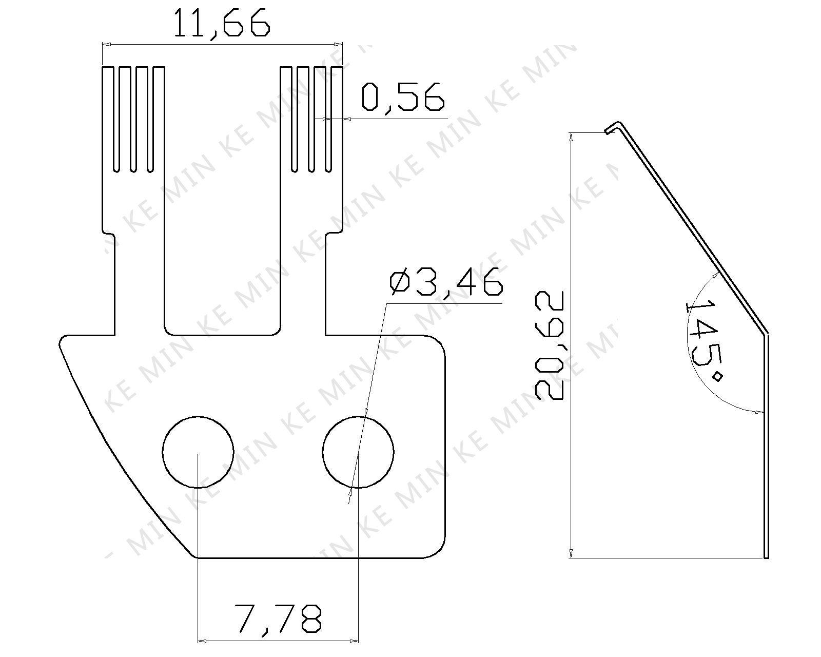 1.基础材料:三元合金1/2 H 2.厚度 :0.08 MM 3.硬度 :HV 330±30 4.同方向每根导线高度差异:0.05 MM 5.工作压力 :40-60g 6.所有未注公差为:±0.02