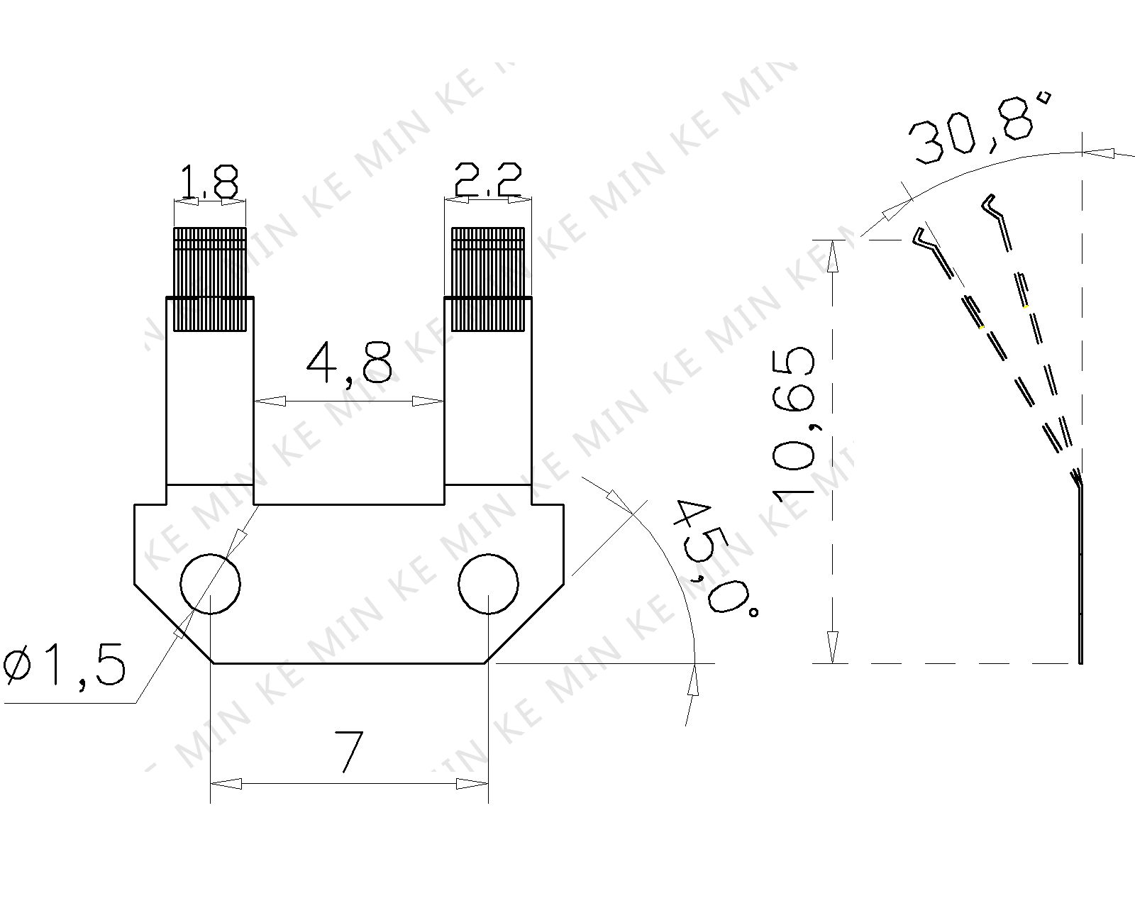 1.基础材料:C17201/2 H 2.厚度 :0.1 MM 3.硬度 :HV 330±30 4.所有未指定半径 :R 0.1 5.焊接最小强度 : 30 N 6.工作压力 :30gf