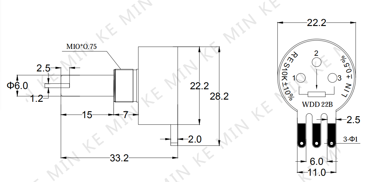 1.阻值范围:1K. 2K 5K 10K 线性精度:±0.5% 2.电气转角:340° 额定功率:0.7W/70°C 3.结缘电阻:>500DC.500V/min 温度范围:-40°-+125° 4.回转寿命:1000万 外壳材质:铝氧化处理(宝蓝色) 5.组织误差:±10% 平滑指数:≤1.5% 6.机械转角:360° 温度系数:±500PPM/°C 7.耐压强度:500V.A.C/min 启动力矩:<0.098N(M) 8应用范围:阀门 操纵杆 纺织机等角度位置的测控